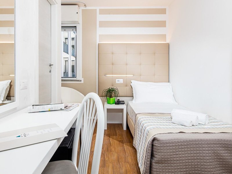 - EZ Standard (EZX1), Einzelzimmer, Mindestalter im Zimmer: 18 Jahre, im Hauptgebäude, ca. 9 m², letzte Komplettrenovierung 2021, letzte Teilrenovierung 2020, Gesamtanzahl der Räume in diesem Zimmertyp: 1, Aufteilung wie folgt: 1 Schlafzimmer, 1 Einzelbett, Klimaanlage: ohne Gebühr, zentral gesteuert, Fußboden: Laminat, Safe: ohne Gebühr, Schreibtisch, Minibar: gegen Gebühr, Wasser, Telefon, Internet: WLAN/WiFi: ohne Gebühr, Fernseher: Sat-TV, Radio, Roomservice: gegen Gebühr, Reinigungsservice, Dusche, WC, Föhn