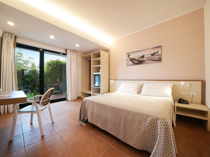 Doppelzimmer (DZ4, ca. 18 qm), einfach eingerichtet. Klimaanlage, Minikühlschrank, WLAN, TV, Safe. Dusche, WC, Föhn. Balkon/Patio im EG. Min. 2E+2K/Max. 4E