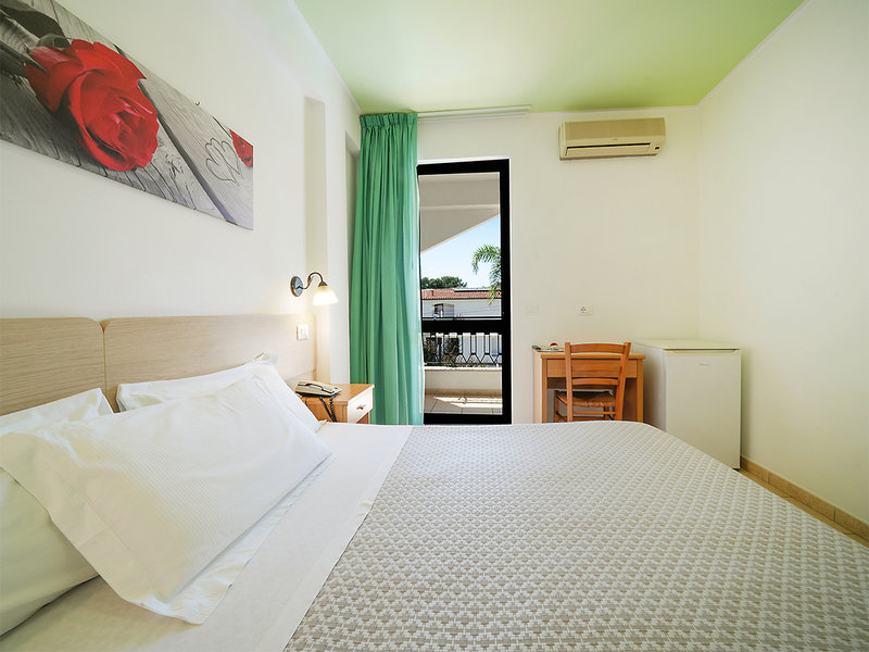 Dvojlôžková izba (DZ4, cca 18 m²), jednoducho zariadená. Klimatizácia, minichladnička, Wi-Fi, TV, trezor, sprchovací kút, WC, fén. Balkón/terasa na prízemí. Min. 2 dospelí + 2 deti, max. 4 dospelí.
