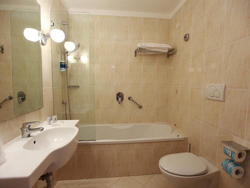 - Twin (DZX1), dvojlôžková izba, nefajčiarska izba, v hlavnej budove, výhľad na hory, výhľad do záhrady, výhľad na ulicu, cca 18 m², naposledy čiastočne zrekonštruovaná v roku 2025, celkový počet izieb v tomto type izby: 1, rozloženie: 1 spálňa, 1 manželská posteľ (160x190cm), detská postieľka: za noc od 10 EUR, klimatizácia: centrálne ovládaná, trezor: zadarmo, pohovka, písací stôl, žehlička, žehliaca doska, chladnička, kávovar/čajník, rýchlovarná kanvica, minibar: za poplatok, voda: za poplatok, alkoholické nápoje: za poplatok, dopĺňanie minibaru: denne, telefón, internet: WLAN/WiFi: zadarmo, televízor: v spálni, nemecké kanály, satelitná TV, izbová služba: za poplatok, upratovacia služba: denne, vaňa alebo sprchovací kút, WC, fén