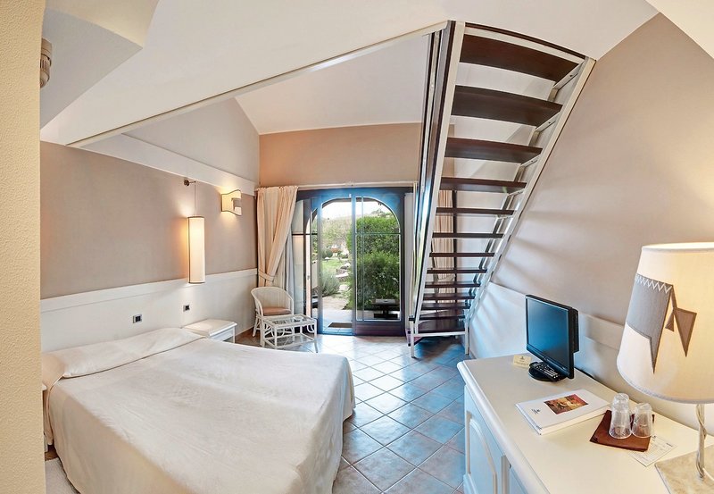 - Doppel, Komfort, Erdgeschoss, 1 Bad, Dusche, WC, Haartrockner, Klimaanlage, Minibar kostenpflichtig, Safe, 1 TV (Sat-TV), WLAN, Terrasse, mit Zwischengeschoss bei Vierfachbelegung
