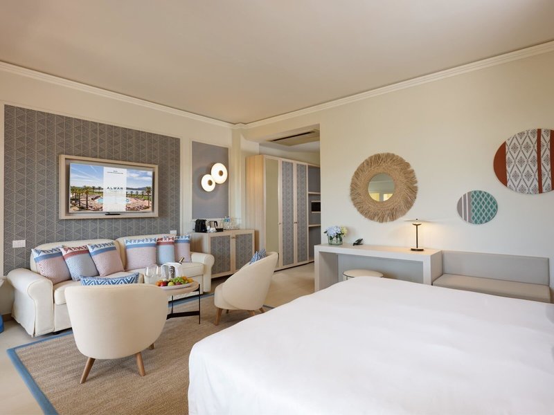 - Prestige Suite Bay Side (SUX2), Suite, Nichtraucherzimmer, im Hauptgebäude, Meerseite, Buchtblick, Poolblick, ca. 45 m², letzte Komplettrenovierung 2025, Gesamtanzahl der Räume in diesem Zimmertyp: 2, Aufteilung wie folgt: kombiniertes Wohn-/Schlafzimmer, 1 Schlafzimmer, 1 King Size Bett, 1 Schlafsofa, Babybett: ohne Gebühr, Anfrage & Reservierung notwendig, Klimaanlage: ohne Gebühr, individuell regelbar, kalt, Fußboden: Fliesenboden, Safe: ohne Gebühr, Sofa, Schreibtisch, Minibar: gegen Gebühr, Softdrinks: gegen Gebühr, Wasser: gegen Gebühr, alkoholische Getränke: gegen Gebühr, Snacks: gegen Gebühr, Minibarauffüllung: täglich, Telefon, Internet: WLAN/WiFi, Fernseher: Flatscreen, im Wohnbereich, im Schlafzimmer, deutsches Programm, Sat-TV, SKY-Programme, Roomservice: täglich, gegen Gebühr, Reinigungsservice: täglich, ohne Gebühr, Regendusche, WC, Bademantel: ohne Gebühr, Slipper: ohne Gebühr, Föhn, Kosmetikspiegel, Balkon oder Terrasse: mit Liegen, mit Sitzgelegenheit