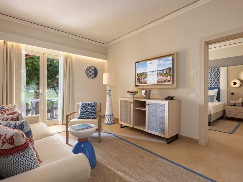 - Prestige Suite Bay Side (SUX2), Suite, Nichtraucherzimmer, im Hauptgebäude, Meerseite, Buchtblick, Poolblick, ca. 45 m², letzte Komplettrenovierung 2025, Gesamtanzahl der Räume in diesem Zimmertyp: 2, Aufteilung wie folgt: kombiniertes Wohn-/Schlafzimmer, 1 Schlafzimmer, 1 King Size Bett, 1 Schlafsofa, Babybett: ohne Gebühr, Anfrage & Reservierung notwendig, Klimaanlage: ohne Gebühr, individuell regelbar, kalt, Fußboden: Fliesenboden, Safe: ohne Gebühr, Sofa, Schreibtisch, Minibar: gegen Gebühr, Softdrinks: gegen Gebühr, Wasser: gegen Gebühr, alkoholische Getränke: gegen Gebühr, Snacks: gegen Gebühr, Minibarauffüllung: täglich, Telefon, Internet: WLAN/WiFi, Fernseher: Flatscreen, im Wohnbereich, im Schlafzimmer, deutsches Programm, Sat-TV, SKY-Programme, Roomservice: täglich, gegen Gebühr, Reinigungsservice: täglich, ohne Gebühr, Regendusche, WC, Bademantel: ohne Gebühr, Slipper: ohne Gebühr, Föhn, Kosmetikspiegel, Balkon oder Terrasse: mit Liegen, mit Sitzgelegenheit