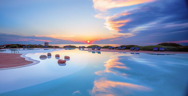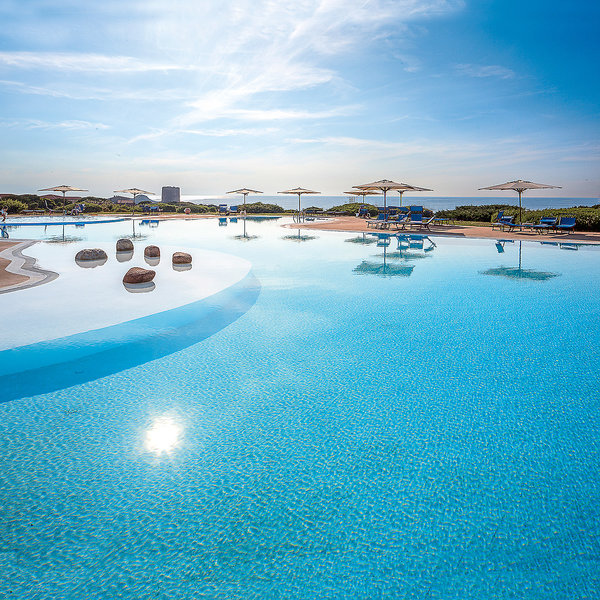 Ein Highlight des Resorts ist das großzügige Thalassozentrum mit seinem beeindruckenden Meerwasserpool. Ebenso laden die weitläufigen Sonnen- und Aussichtsterrassen sowie eine abwechslungsreiche Gastronomie in zwei Restaurants ein, die die sardische Küche täglich neu und kreativ inszenieren.