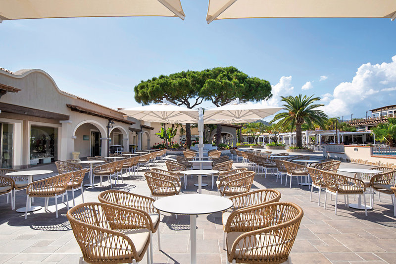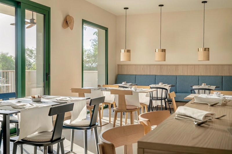 - Jedlá pre hostí ubytovaných v ubytovacích jednotkách „Dimora“ sa podávajú v rodinnej časti reštaurácie Oasys. Jedlá v izbách „Domus“ Standard a Junior Suite sa podávajú v reštaurácii Mirto (rezervovaný stôl). Jedlá v izbách „Monte Garden“ Superior a Casbah sa podávajú v reštaurácii Oasys, buď vnútri alebo vonku. Raňajky a večere sú v reštaurácii Mirto a obed v reštaurácii Oasys.