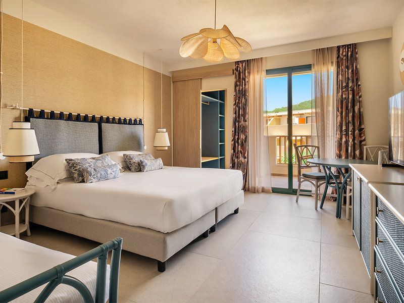 Dvojlôžková izba Deluxe (DZD, cca 34 m², 200 – 300 m od pláže), na 2./3. poschodí, s dvoma samostatnými lôžkami, rozkladacou pohovkou pre dve osoby, klimatizáciou, TV, trezorom, Wi-Fi pripojením a minibarom (za poplatok). Sprcha, WC a sušič vlasov. Terasa/patio. Max. 2 osoby. Vybraná zóna Tanka so samostatným bazénom, wellness/fitness zónou, neskorými raňajkami a rezerváciou v reštaurácii „La Terrazza del Mirto“ sú zahrnuté vybrané nápoje.