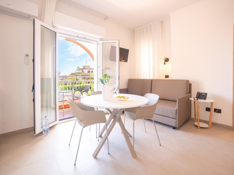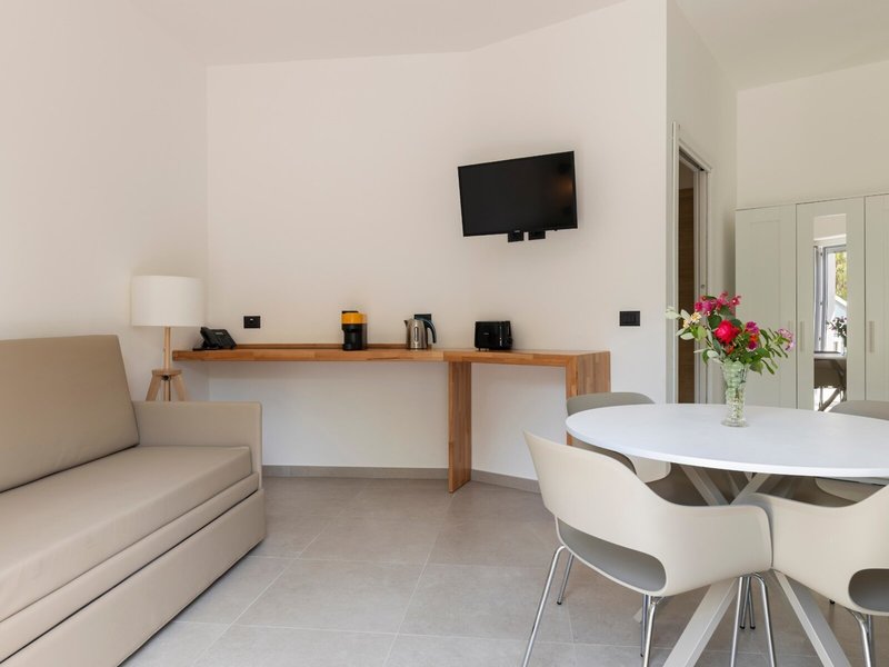 - Superior 1 spálňa, terasa (prízemie) alebo balkón, max. 3 osoby (APG7), apartmán, nefajčiarska izba, výhľad do záhrady, celkový počet izieb v tomto type izby: 2, rozloženie: obývacia izba/spálňa, 1 spálňa, 1 manželská posteľ (180x210cm), 1 rozkladacia pohovka (85x1902cm), detská postieľka: bezplatne, na požiadanie, klimatizácia: bezplatne, individuálne ovládaná, studená, teplá, podlaha: dlažba, trezor, kuchynský kút, chladnička, varná doska, mikrovlnná rúra, kávovar Nespresso, kanvica, hriankovač, jedálenský stôl, internet: WLAN/WiFi: bezplatne, televízor: plochá obrazovka, upratovanie: raz týždenne, bezplatne, sprcha, WC, fén, balkón alebo terasa: s posedením