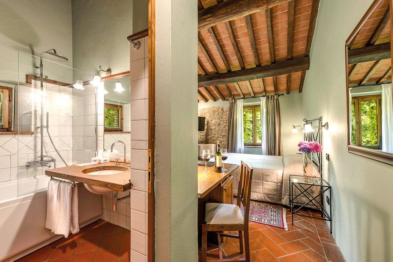 Diese historische Mühle aus dem 15. Jahrhundert wurde mit viel Respekt vor der originalen Architektur zu einem Hotel umgebaut. Sie liegt in einem kleinen Tal, eingebettet in die Chianti-Hügel, versteckt zwischen Eichen- und Kastanienbäumen – eine besondere Empfehlung für Romantiker. Alle Bereiche und Zimmer sind im typischen Toskana-Stil gehalten, mit Natursteinmauern, Deckenbalken und gusseisernen Bettgestellen.