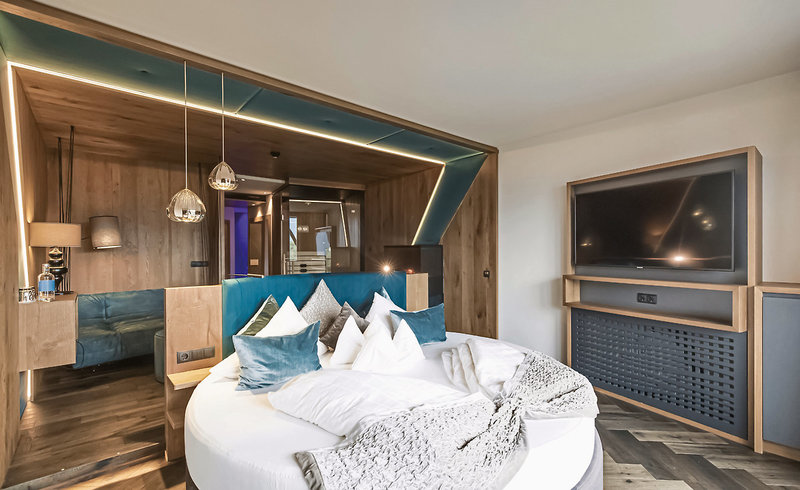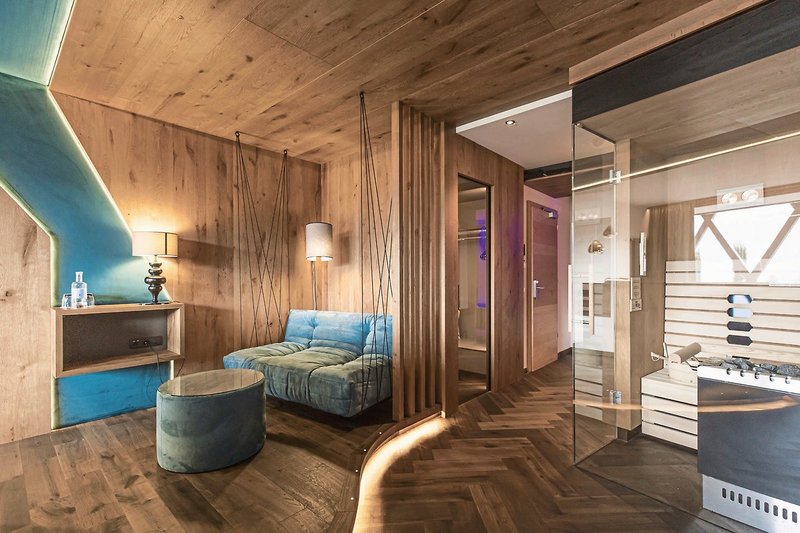 - 41-45 qm, Suite, kombinierter Wohn-/Schlafraum, begehbarer Kleiderschrank, Effektfeuerofen, Ankleidebereich, Sitzecke, Schreibtisch, Boxspringbett, Badewanne, Regendusche, Bidet, separates WC, Bademantel, Haartrockner, Kosmetikspiegel, Parkett, Minibar kostenpflichtig, Safe, TV (Sat-TV, Flachbildschirm), WLAN, Balkon (möbliert), Sauna