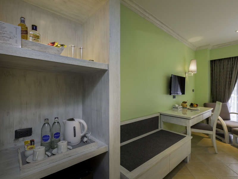 - Grand Superior Room (DZX2), Doppelzimmer, Poolblick, ca. 44 m², Klimaanlage: individuell regelbar, Fußboden: Fliesenboden, Safe: ohne Gebühr, Kaffee-/Teezubereiter, Minibar: gegen Gebühr, Telefon, Internet: WLAN/WiFi: ohne Gebühr, Fernseher: Flatscreen, deutsches Programm, Sat-TV, Roomservice: täglich 08:00 Uhr - 21:00 Uhr, gegen Gebühr, Reinigungsservice: täglich, ohne Gebühr, Dusche, WC, Bademantel, Slipper, Föhn, Balkon oder Terrasse: mit Sitzgelegenheit