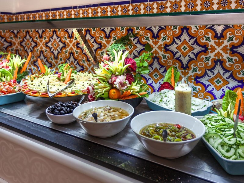 Essen & Trinken: Die gastronomischen Einrichtungen umfassen einen Frühstückssaal, ein Café und eine Bar. Die Gäste werden kulinarisch verwöhnt im Nichtraucherrestaurant mit Klimaanlage und Kinderhochstühlen. Die Unterbringung bietet als buchbare Verpflegungsleistungen Übernachtung inkl. Frühstück, Halbpension, Vollpension und All-Inclusive. Ein reichhaltiges Frühstücksbuffet, Mittagessen und ein vielfältiges Abendbuffet sind lecker und abwechslungsreich gestaltet. Vegetarische Gerichte und Kindermenüs werden auf Wunsch zubereitet. Darüber hinaus stellt das Haus Snacks bereit. Das Hotel führt ein Sortiment alkoholischer und alkoholfreier Getränke.