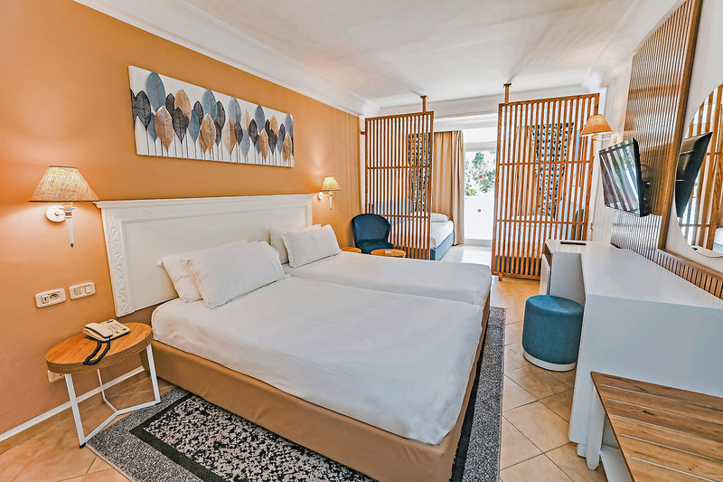 - 31-35 qm, Familien, Hauptgebäude, Gartenblick, kombinierter Wohn-/Schlafraum, Einzelbett, Twinbett, Doppelbett, 1 Bad, Dusche oder Badewanne, 1 WC, separates WC, Haartrockner, Kosmetikspiegel, Fliesen, Klimaanlage, individuell regulierbar, ca. 15.6.-15.9., Heizung, Mini-Kühlschrank, Safe, 1 TV (Sat-TV, deutschsprachiges Programm, landestypisches Programm), WLAN, Balkon, Bettwäschewechsel (3 x wöchentlich), Handtuchwechsel (täglich)
