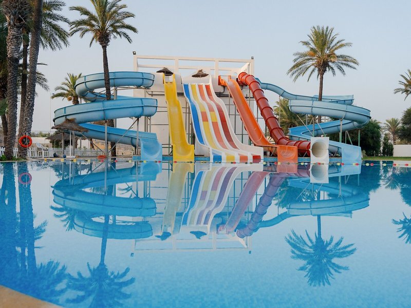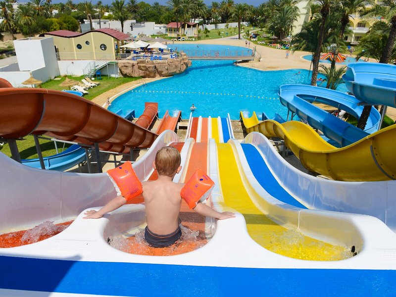 - Pools:Kinderbecken, Aquapark, Indoor Pool, Outdoor Pool, Sonnenschirme am Pool, Liegen am Pool, Handtücher, Wasserrutsche