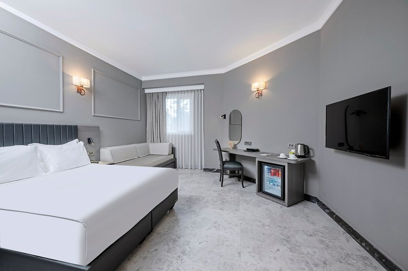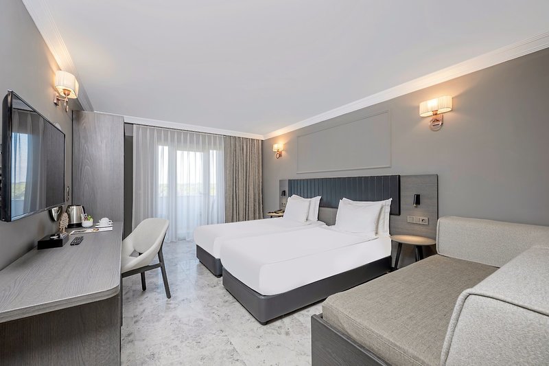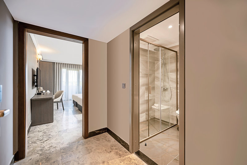 - 26-30 m2, dvojlôžková, hlavná budova, písací stôl, manželské postele (1 manželská posteľ alebo 2 samostatné lôžka), 2 rozkladacie pohovky, 1 kúpeľňa, sprcha, sušič vlasov, dlažba, klimatizácia, centrálne ovládanie, minibar, trezor, TV (satelitná TV ), WiFi