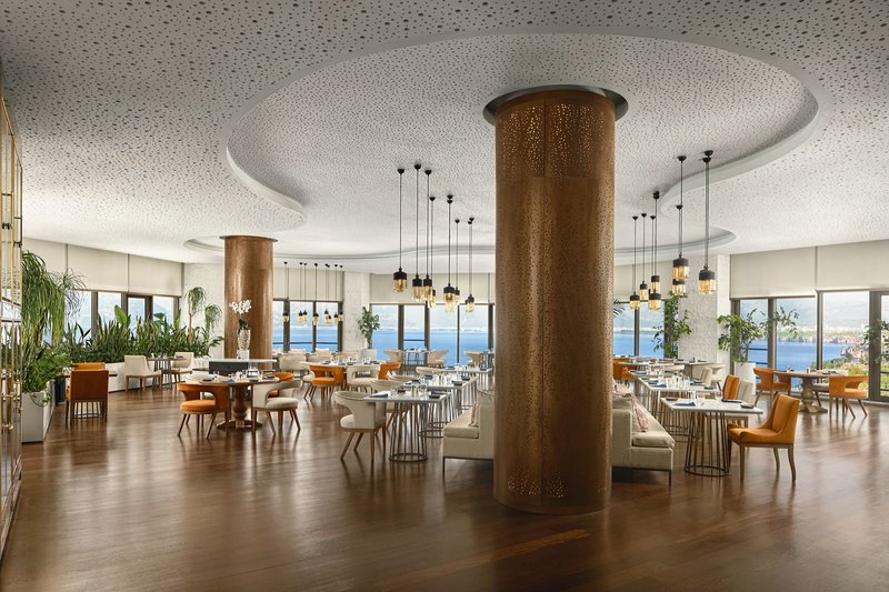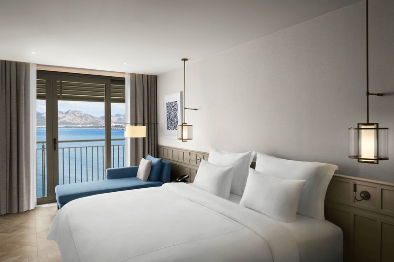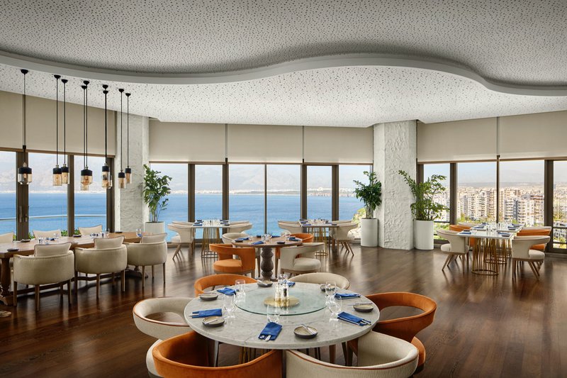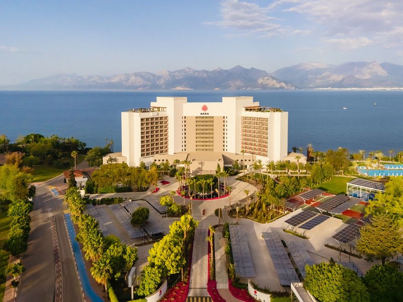 Ausstattung: Das im Winter 2025/26 renovierte komfortable Urlaubsdomizil bietet 471 Zimmer, die sich auf 10 Etagen verteilen. Zu den Annehmlichkeiten zählen die großzügige Empfangshalle mit Rezeption, Lifts, schicke Sitzmöbel und eine Lobbybar mit Blick auf das Meer. Außerdem das Hauptrestaurant mit Terrasse (wetterbedingt), diverse À-la-carte-Restaurants, exklusive Geschäfte (gegen Gebühr), mehrere Bars (gegen Gebühr), eine Urban Chic Lounge auf der obersten Etage (kostenlos nutzbar für Gäste der Skyline Suite und Suite Meerblick), moderne Konferenzräume und der Wellnessbereich mit schönem Hallenbad (saisonbedingt beheizbar). Im Hotelbereich und in den Zimmern ist Wi-Fi inklusive. Im gepflegten Garten finden Sie im Sommer den Swimmingpool mit separatem Kinderbecken, ein Infinity Pool, Sonnenterrasse mit Blick auf das Meer und auf das Taurusgebirge und die Pool-Snackbar sowie großem Badeplateau (saisonbedingt). Liegen, Auflagen, Badetücher und Sonnenschirme sind inklusive. Der Akra V Hotel Komplex (4 Sterne) mit 58 Zimmern auf fünf Etagen befindet sich auf der anderen Straßenseite und ist über eine Fußgängerbrücke mit dem Akra Antalya verbunden. Die Angebote aus dem Akra V Hotel können mitbenutzt werden.