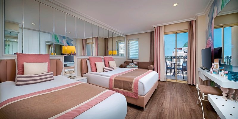 - 26-30 m2, dvojlôžková, výhľad na more (bočný), gauč, 1 jednolôžko, 1 manželská posteľ, 1 kúpeľňa, sprcha, fén, laminátová podlaha, klimatizácia, centrálne ovládané, minibar, pravidelne dopĺňaný, trezor, 1 TV (satelit) TV), balkón , Počet izieb: 193