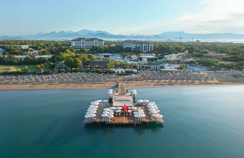 Ausstattung: Das Luxushotel verfügt über 583 Zimmer, verteilt auf 6 Etagen. Der Innenbereich umfasst obere und untere Lobbybars, Rezeption und sechs Lifts. Der kostenlose Wi-Fi-Internetzugang ist in allen Bereichen unseres Resorts, einschließlich in unserer Leseecke, verfügbar. Zu den Einrichtungen zählt zudem ein Hauptrestaurant mit Terrasse, drei Snack-Restaurants sowie diverse Bars und zwei Patisserien. Im Hauptrestaurant können sich die Gäste an den Buffets bedienen. Zusätzlich gibt es einen separaten Bereich nur für Erwachsenen im Hauptrestaurant. Diverse À-la-carte-Restaurants von weltweiten Küchen können Sie nach Verfügbarkeit, Voranmeldung und einige gegen Gebühr besuchen. Minimarkt, Shop, Friseur (jeweils gegen Gebühr). Das Hallenbad mit separatem Kinderbecken rundet die Innenausstattung ab (im Winter beheizt). Die Poollandschaft umfasst einen saisonal geöffneten Süßwasserpool sowie eine Poolbar (saisonabhängig), drei separate Kinderbecken und sechs Wasserrutschen für Erwachsene und vier für Kinder. Darüber hinaus können sich die Gäste in den Ausruhbereichen der privaten Gartenanlage entspannen. Am Strand und am Pool stehen Sonnenliegen und Sonnenschirme sowie Handtücher bereit. An der Strandbar (saisonabhängig, wetterbedingt) können die Gäste Snacks und Erfrischungsgetränke genießen.