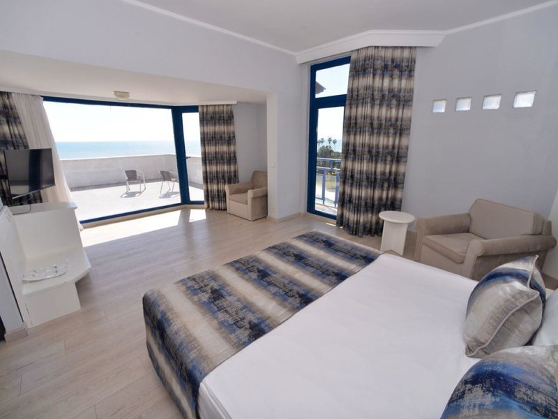 - Terrace Suite Sea View (SUX1), Suite, im Hauptgebäude, Meerblick, ca. 38 m², letzte Komplettrenovierung 2020, Gesamtanzahl der Räume in diesem Zimmertyp: 1, Aufteilung wie folgt: 1 Schlafzimmer, 2 Einzelbetten, 1 Doppelbett, Babybett: ohne Gebühr, Anfrage notwendig, Reservierung nicht notwendig, Klimaanlage: ohne Gebühr, saisonabhängig, Heizung: saisonabhängig, Fußboden: Laminat, Safe: ohne Gebühr, Minibar: ohne Gebühr, Softdrinks: ohne Gebühr, Wasser: ohne Gebühr, Minibarauffüllung: täglich, Telefon, Fernseher: Flatscreen, Roomservice: täglich 24 Stunden, gegen Gebühr, Reinigungsservice: täglich, ohne Gebühr, Badewanne, WC, Slipper: ohne Gebühr, Föhn, Terrasse: mit Liegestühlen