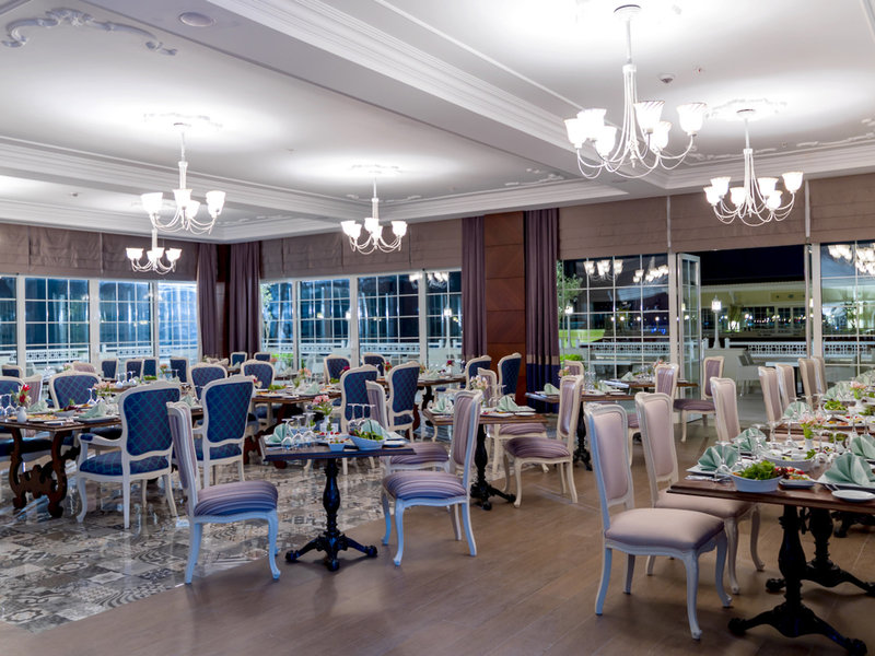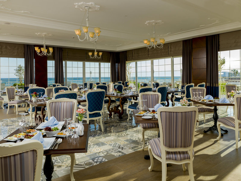 - Hauptrestaurant „Güral Premier Restoran“: Küche: international, türkisch, Buffet, Anfrage & Reservierung nicht notwendig, ohne Gebühr, bei All Inclusive inklusive, saisonabhängig, täglich 24 Stunden, klimatisierbar, mit Terrasse, Raucherbereich, Kinderhochstuhl, angemessene Kleidung erwünscht