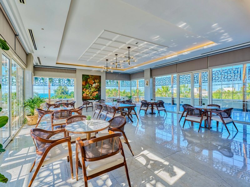 - Reštaurácia Plážová Reštaurácia: Kuchyňa: medzinárodná, turecká, à la carte, nie je potrebná požiadavka a rezervácia, zdarma, v závislosti od sezóny v rámci All Inclusive; V závislosti od počasia, 24 hodín denne, klimatizované, s terasou, na pláži, vysoká stolička