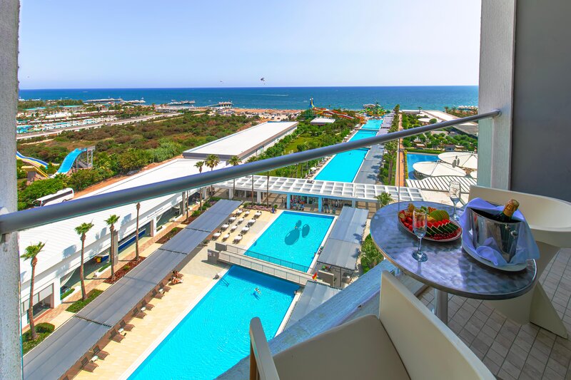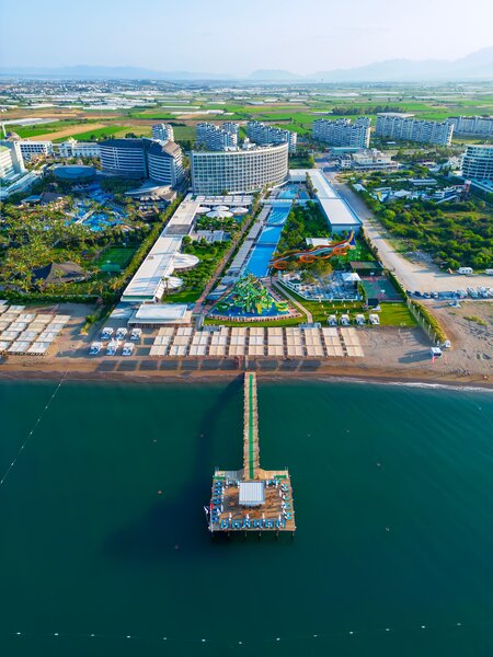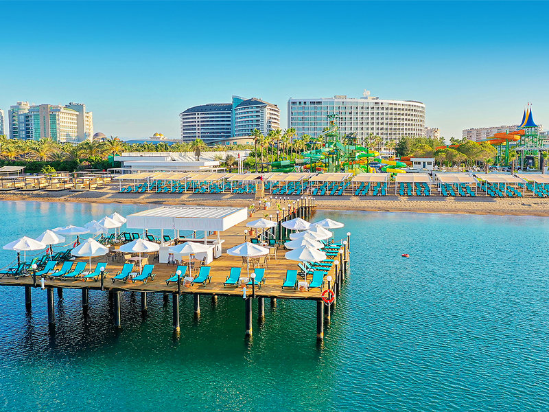 Ausstattung: Kompakte, im Winter 21/22 teilrenovierte Ferienanlage mit Poollandschaft. Aquapark mit Wasserrutschen und Relaxpool (jeweils wetterabhängig beheizt im April und ab ca. Mitte Oktober). Liegen, Schirme, Badetücher am Pool und am Strand, Pool-/ Snackbar, Beachbar. Empfangshalle, Rezeption, Hauptrestaurant, 3 À-la-carte Restaurants (Fisch (gegen Gebühr), italienisch, türkisch), Bars, Geschäfte, Friseur. Landeskategorie: 5 Sterne, 400 Zimmer.