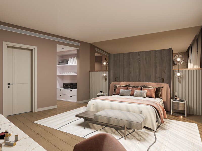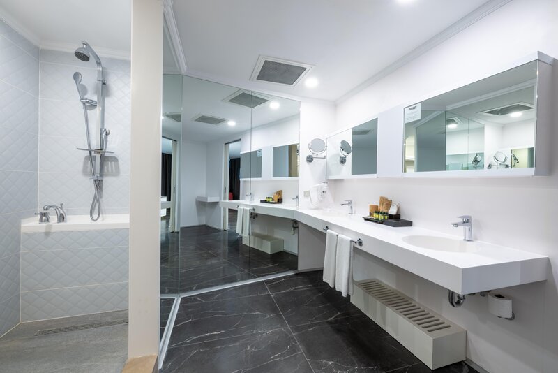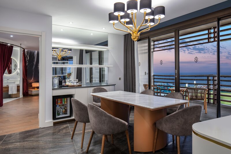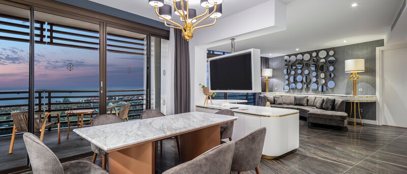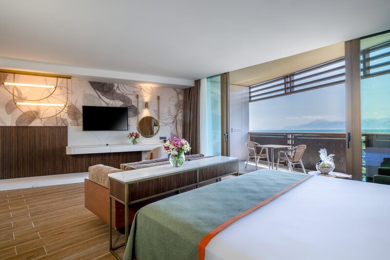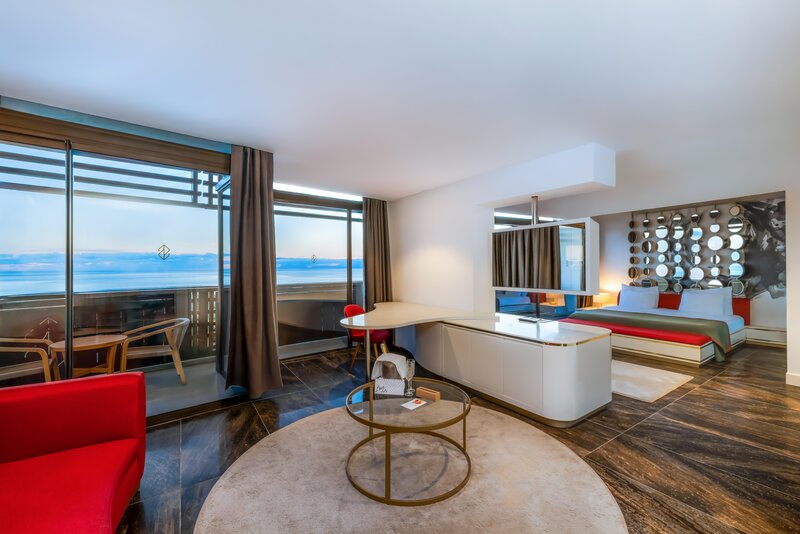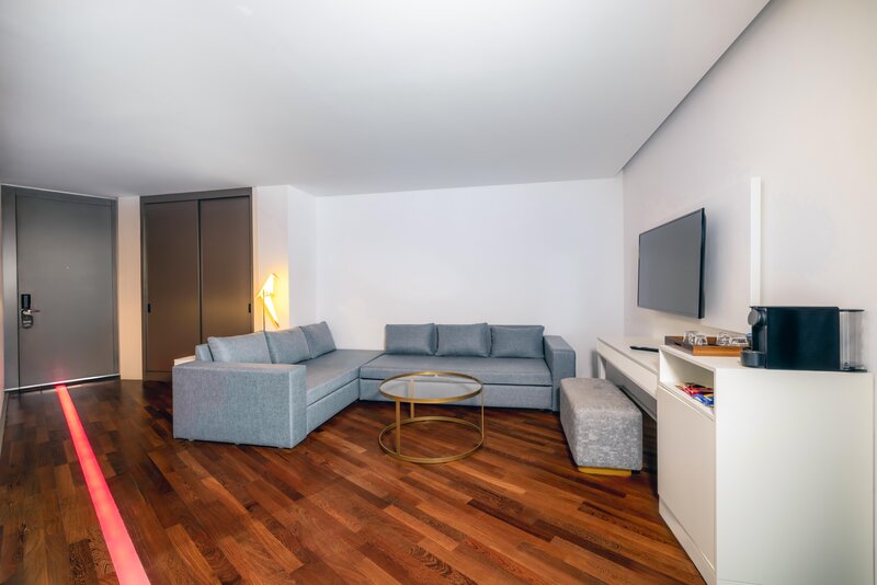 Junior Suite (JS, cca 51 m²), klimatizácia, Smart TV (26 palcov), Wi-Fi, minibar, kávovar Nespresso®, trezor. Sprcha/vaňa, WC, fén. Balkón. Max. 2 dospelí + 1 dieťa