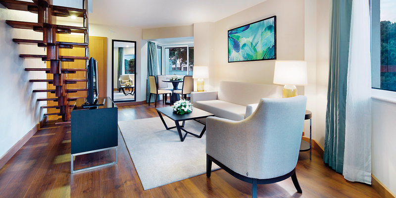 - Hlavná budova, výhľad na krajinu, nefajčiarske, 1 samostatná obývačka, kombinovaná obývačka/spálňa, manželská posteľ, rozkladacia pohovka, sprcha, WC, fén, klimatizácia, centrálne ovládané, minibar, pravidelne dopĺňaný, trezor, 1 TV (satelit TV), rýchlovarná kanvica, káva/čaj, balkón (zariadený)