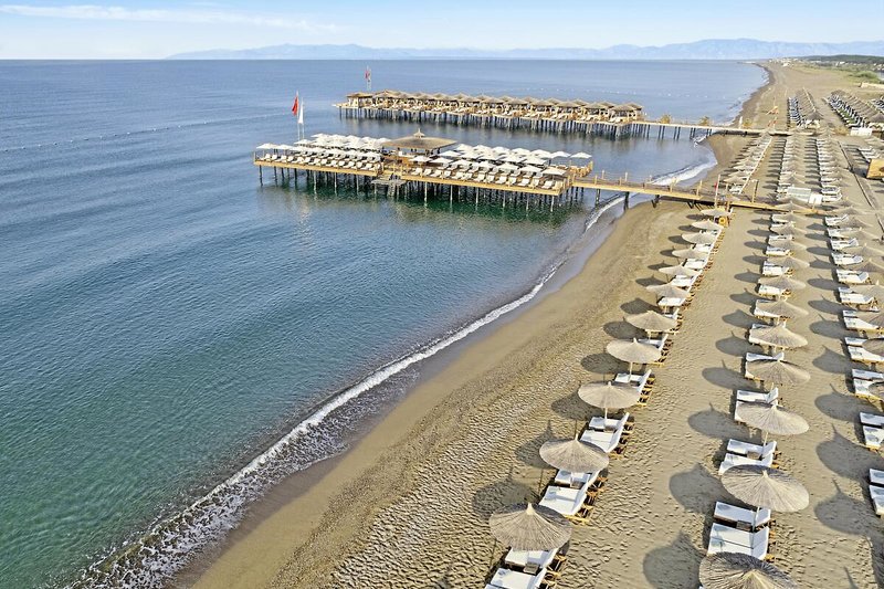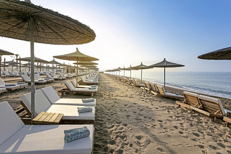 - Piesočnato-kamienková pláž: mierne svahovita, súčasť komplexu, dlhá cca 1 km, oddelená od komplexu cestou, slnečníky, ležadlá, kabínka (za poplatok), plážový uterák, mólo na kúpanie (ležadlá, slnečníky, bar), 01.04.-31.10., (vonkajšie priestory otvorené v závislosti od počasia)