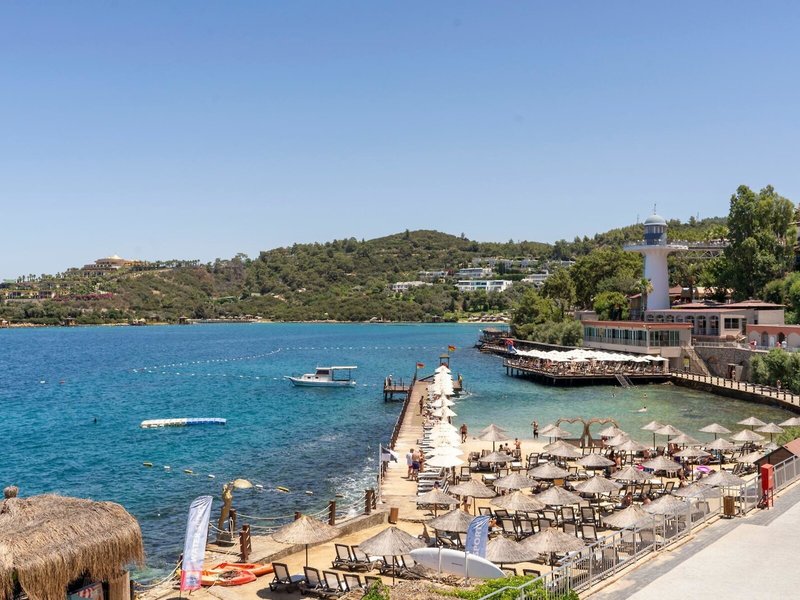 Poloha a okolie Tento plážový hotel vhodný pre rodiny s deťmi má výbornú polohu na úbočí malého kopca a ponúka výhľad na jeho krásnu súkromnú pláž v zálive Bodrum. Vzdialenosť do centra mesta Bodrum je približne 9 km a do Milas je približne 40 km. Transfer z/do Bodrumu (BJV) cca 50 minút, z/do Izmiru (ADB) cca 3 hodiny.