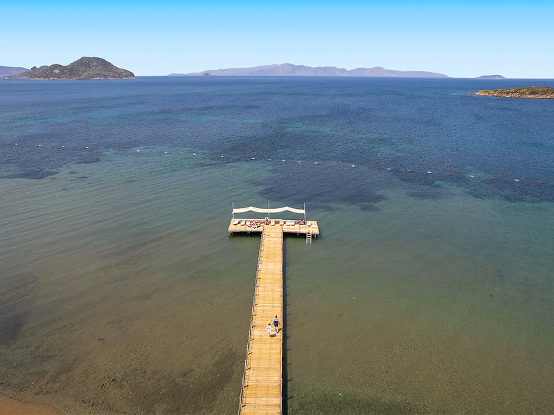 Poloha: Priamo na mierne sa zvažujúcej piesočnatej pláži. Možnosti nakupovania a zábavy sú k dispozícii v meste Turgutreis, ktoré je vzdialené približne 3 km. Centrum mesta Bodrum je vzdialené približne 18 km (k dispozícii je mikrobusové spojenie).