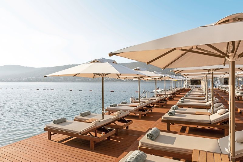 - 81-90 qm, Doppel, Deluxe, Meerseite, Meerblick (zum Teil), Bettwäsche, Handtücher und Matratzen aus 100% Bio-Baumwolle, optisch getrennter Wohn-/Schlafraum, Sitzecke, Schreibtisch, Doppelbett, Dusche, Badewanne, separates WC, Bademantel, Badeslipper, Haartrockner, Kosmetikspiegel, Klimaanlage, zentral gesteuert, Minibar, Auffüllung täglich, Safe, Bügelbrett, Bügeleisen, TV (Sat-TV), Wasserkocher, Espressomaschine, Kaffee/Tee, Terrasse (möbliert), direkter Poolzugang, Gemeinschaftspool, Kopfkissen-Menü, hochwertige Badartikel, Aufdeck-Service
