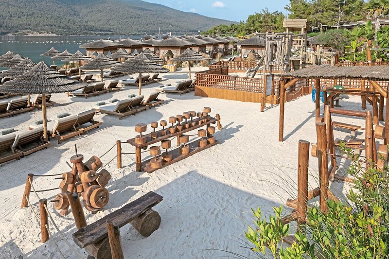 - Piesočnatá pláž: patrí ku komplexu, dlhá cca 350 m, slnečníky, ležadlá, kabínka (za poplatok), plážový uterák, plážový servis, mólo na kúpanie (ležadlá)