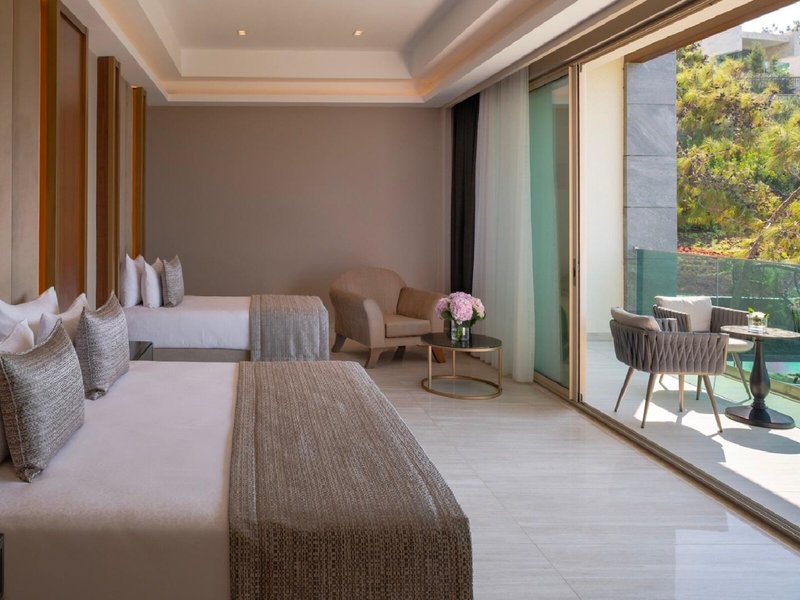 - Family Suite Seaview (FZM1), Familienzimmer, im Hauptgebäude, Meerblick, ca. 75 m², Gesamtanzahl der Räume in diesem Zimmertyp: 2, Aufteilung wie folgt: Kinderzimmer, 1 Schlafzimmer, 2 Einzelbetten, 1 Doppelbett, Babybett: ohne Gebühr, Anfrage notwendig, Klimaanlage: ohne Gebühr, zentral gesteuert, Heizung: zentral gesteuert, Safe: ohne Gebühr, Schreibtisch, Kaffee-/Teezubereiter, Wasserkocher, Minibar: ohne Gebühr, Softdrinks: ohne Gebühr, Wasser: ohne Gebühr, Minibarauffüllung: täglich, Telefon, Internet: WLAN/WiFi: ohne Gebühr, Fernseher: Flatscreen, deutsches Programm, Sat-TV, Roomservice: täglich, gegen Gebühr, Reinigungsservice: täglich, ohne Gebühr, Dusche, WC, Bademantel: ohne Gebühr, Slipper: ohne Gebühr, Föhn, Kosmetikspiegel, Balkon: mit Sitzgelegenheit