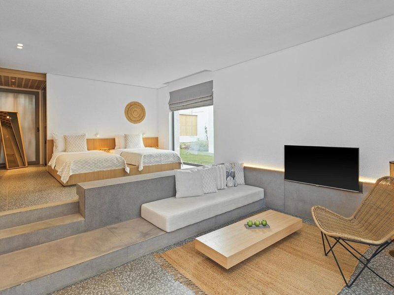 - Olive Family (FZG1), Familienzimmer, Nichtraucherzimmer, im Nebengebäude, Gartenseite, Gartenblick, ca. 75 m², letzte Komplettrenovierung 2020, Gesamtanzahl der Räume in diesem Zimmertyp: 2, Aufteilung wie folgt: kombiniertes Wohn-/Schlafzimmer, 1 Schlafzimmer, 2 Einzelbetten, 1 Doppelbett (180x200cm), 1 Schlafsofa, Babybett: ohne Gebühr, Anfrage & Reservierung notwendig, Klimaanlage: ohne Gebühr, zentral gesteuert, kalt, Fußboden: Fliesenboden, Safe: ohne Gebühr, Sofa, Nespressomaschine, Kaffee-/Teezubereiter, Wasserkocher, Minibar: ohne Gebühr, Softdrinks: ohne Gebühr, Wasser: ohne Gebühr, alkoholische Getränke: ohne Gebühr, Snacks: ohne Gebühr, Minibarauffüllung: täglich 24 Stunden, Telefon, Internet: WLAN/WiFi: ohne Gebühr, Fernseher: Flatscreen, im Schlafzimmer, deutsches Programm, Sat-TV, Roomservice: täglich, gegen Gebühr, Reinigungsservice: täglich, ohne Gebühr, separate Dusche, separates WC, Slipper: ohne Gebühr, Föhn, Kosmetikspiegel, Terrasse: mit Sitzgelegenheit
