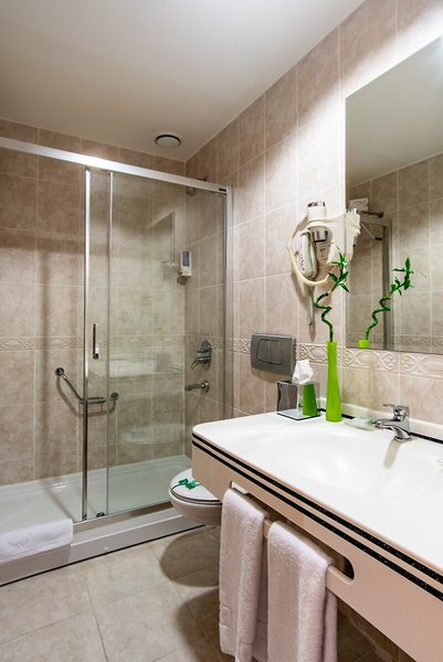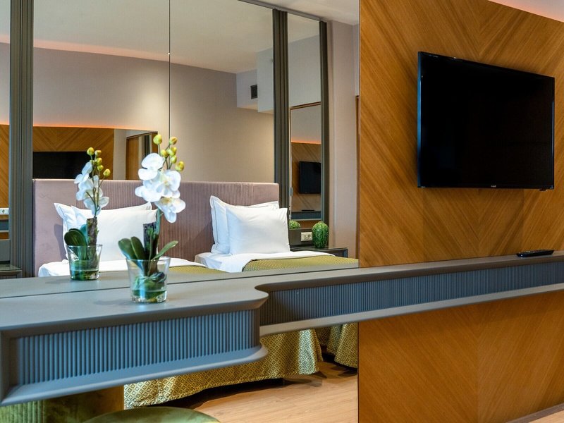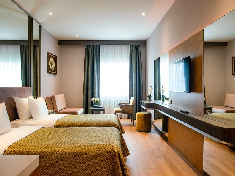 Ubytovanie: Klimatizácia a individuálne ovládané kúrenie zabezpečujú príjemnú vnútornú klímu v izbách. Izby s kobercom sú vybavené manželskou posteľou alebo posteľou queen. Prístelky je možné vyžiadať. K dispozícii je aj trezor, minibar a písací stôl. K dispozícii je tiež mini chladnička a príslušenstvo na prípravu čaju/kávy. Telefón s priamou voľbou, TV so satelitným/káblovým príjmom, budík a WiFi poskytujú najlepší dovolenkový komfort. V ubytovacej jednotke nájdete papuče. Kúpeľňa je vybavená sprchovacím kútom, vaňou, sušičom vlasov a telefónom. Ako zvláštnosť si hostia môžu vychutnať kozmetické produkty a výber uterákov v kúpeľniach. Rezervovať je možné aj bezbariérové izby s bezbariérovými kúpeľňami. Hotel ponúka rodinné izby, 92 nefajčiarskych a fajčiarskych izieb.