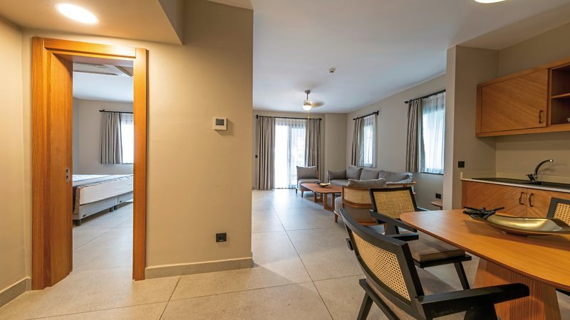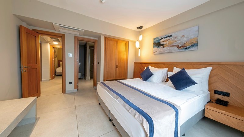 - 51-60 qm, Familien, 2 separate Schlafzimmer, separater Wohnraum, 2 Bäder, Dusche, WC, Haartrockner, Fliesen, Klimaanlage, zentral gesteuert, Minibar, Auffüllung täglich, Softdrinks, Mineralwasser, Bier, Säfte, Wasser, Safe, 3 TVs (Sat-TV, Flachbildschirm, Smart-TV), Wasserkocher, Kaffee/Tee, Balkon