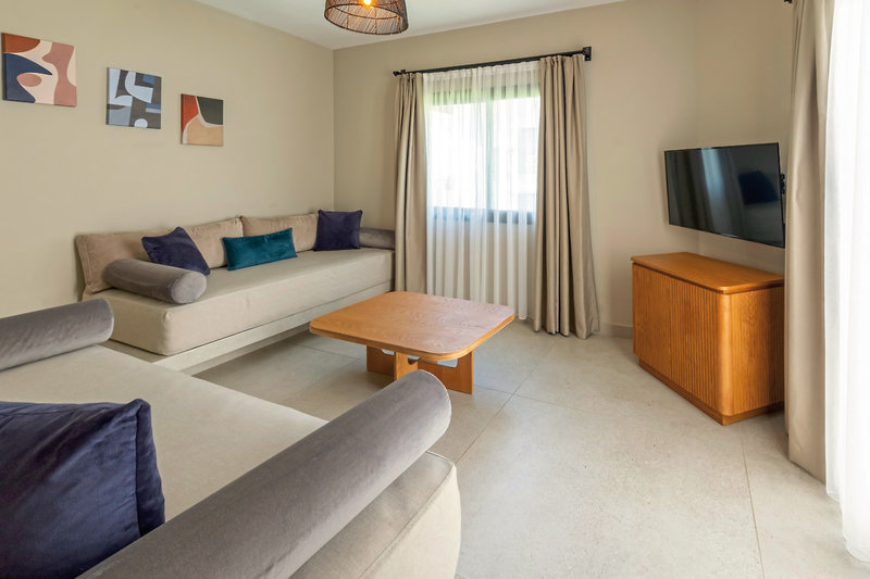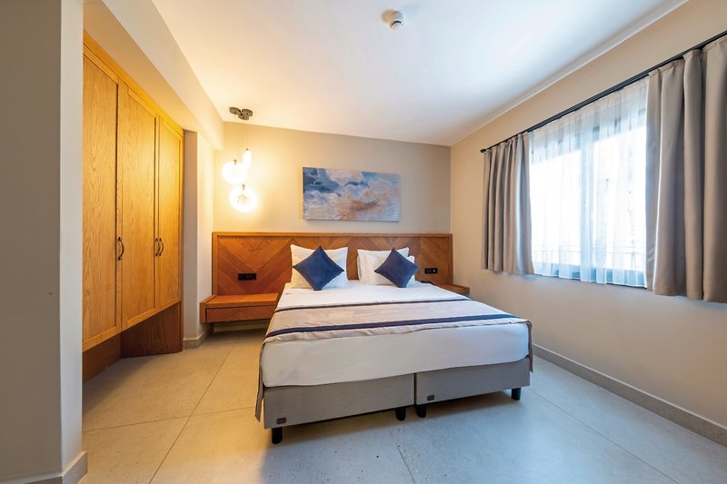 - 41-45 qm, Familien, separates Schlafzimmer, separater Wohnraum, Dusche, WC, Haartrockner, Fliesen, Klimaanlage, individuell regulierbar, Minibar, Auffüllung täglich, Softdrinks, Mineralwasser, Säfte, Wasser, Safe, 2 TVs (Sat-TV, Flachbildschirm, Smart-TV), Wasserkocher, Kaffee/Tee, Balkon