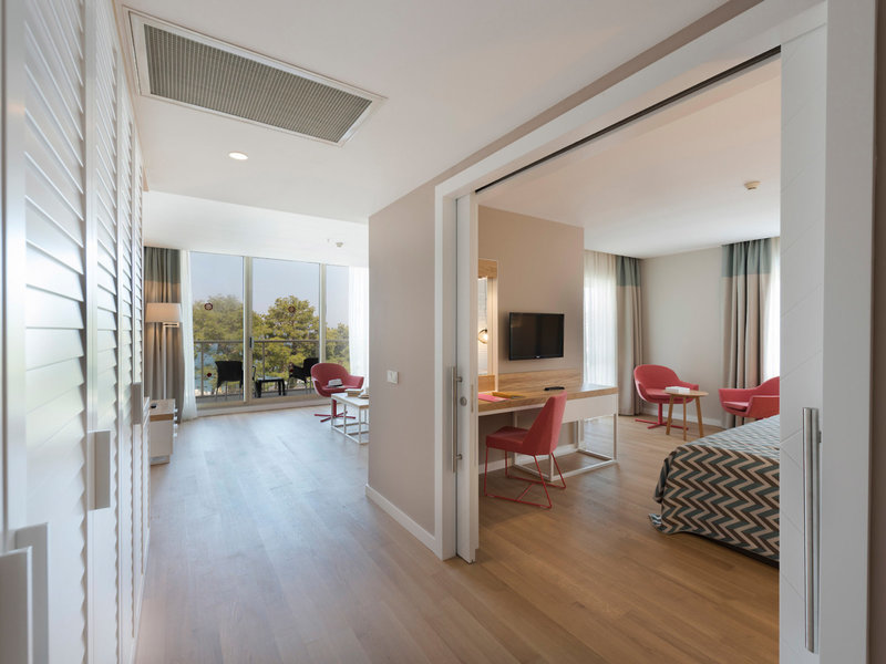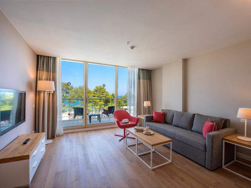 • Jednolôžková izba Superior s dieťaťom, bočný výhľad na more (DSX3), dvojlôžková izba, nefajčiarska izba, v hlavnej budove, bočný výhľad na more, cca. 24 - 24 m², posledná kompletná rekonštrukcia v roku 2018, posledná čiastočná rekonštrukcia v roku 2016, Celkový počet izieb v tomto type izby: 1, Rozloženie: Kombinovaná obývacia izba/spálňa, Detská postieľka: bezplatne, žiadosť a rezervácia nie sú potrebné, Klimatizácia: bezplatne, sezónna, individuálne ovládaná, studená, teplá, Podlaha: Parkety, Trezor: bezplatne, Kanvica, Minibar: bezplatne, Dopĺňanie minibaru: denne, Telefón, Internet: WLAN/WiFi: bezplatne, Televízor: Plochá obrazovka, Izbová služba: 24 hodín denne, za poplatok, Sprcha, WC, Župan: bezplatne, Papuče: bezplatne, Fén, Balkón: s posedením