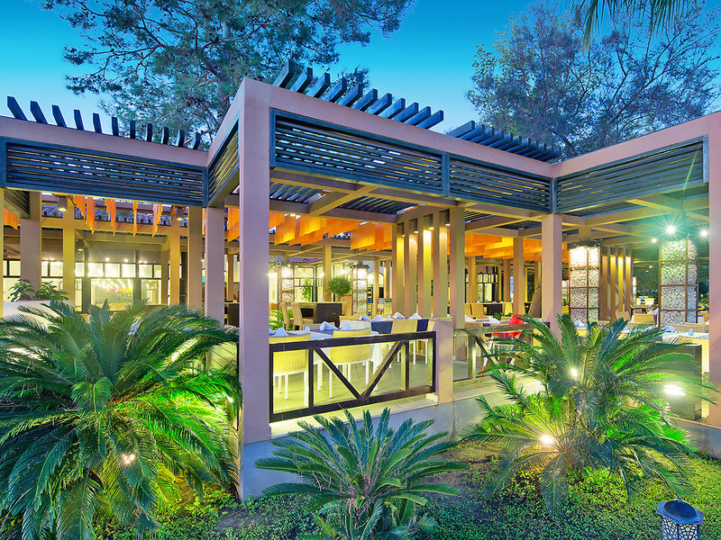 Ausstattung: Schöne und gepflegte Gartenanlage mit 2 Swimmingpools, Infinitypool, Aquapark mit 9 Rutschen (stdw.), Sonnenterrassen. Poolbar. Liegen, Auflagen, Schirme, Badetücher am Pool/Strand. Empfangsbereich, WLAN im ges. Hotel inkl. (außer auf den Zimmern), Hauptrestaurant mit Terrasse, 2 À-la-carte-Restaurants (mediterran, Steakhouse; geg. Geb.; Reserv.), Friseur, Patisserie, Minimarkt, Geschäfte. Landeskat.: 5 St., 443 Zi., 1-2 Etg.