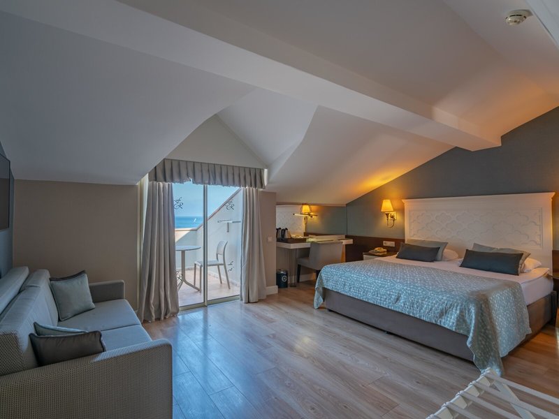 - Single with Child Double Standard Side Sea View (DSM1), Einzelzimmer, im Hauptgebäude, Meerblick, seitlicher Meerblick, ca. 22 m², letzte Komplettrenovierung 2015, Gesamtanzahl der Räume in diesem Zimmertyp: 1, Aufteilung wie folgt: kombiniertes Wohn-/Schlafzimmer, 1 Einzelbett, Babybett: ohne Gebühr, Anfrage & Reservierung notwendig, Klimaanlage: ohne Gebühr, saisonabhängig, zentral gesteuert, Fußboden: Laminat, Safe: ohne Gebühr, Kaffee-/Teezubereiter, Minibar: ohne Gebühr, Softdrinks: ohne Gebühr, Minibarauffüllung: täglich, Telefon, Internet: WLAN/WiFi: ohne Gebühr, Fernseher, Reinigungsservice: täglich, ohne Gebühr, Dusche, WC, Föhn, Balkon, Französischer Balkon