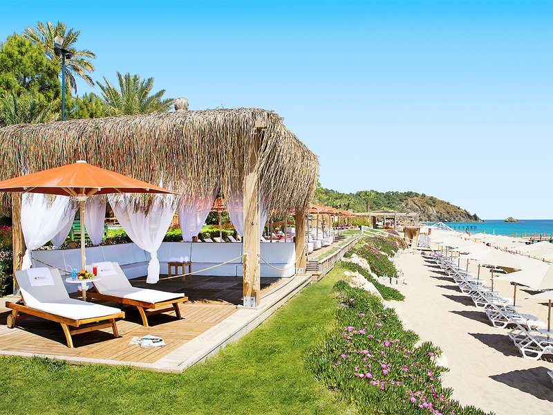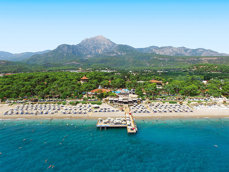 Lage: Direkt am malerischen Strand (Sandstrand mit Kies durchsetzt) und vor der Kulisse des Taurus-Gebirges. Bis zum Ortszentrum von Tekirova ca. 1 km. Das Zentrum von Kemer mit zahlreichen Einkaufs- und Unterhaltungsmöglichkeiten ist ca. 17 km entfernt (Minibusverbindungen).