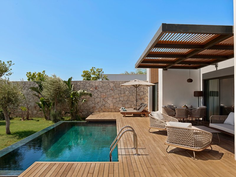 Dvojlôžková izba s priamym vstupom do bazéna/izba Deluxe s bazénom (možno rezervovať deti od 6 rokov): Izba sa nachádza v zmiešanej časti (komunitná časť). Majú približne 60-70 m² (vrátane terasy) a môžu ubytovať 2+1/3+0 osôb. Izba je vybavená super king size posteľou (200*200) + pohovkou alebo 2 super samostatnými lôžkami (120*200) + kreslo a má priamy výhľad na more. Klimatizácia, toaletný stolík a zrkadlo, šatňa, sušič vlasov, žehlička na vlasy, žehlička a žehliaca doska, kávovar Nespresso, súprava na prípravu čaju a kávy, 55-palcová TV, Chromecast, parketové podlahy, dvojité umývadlá a dažďová sprcha a ručná sprcha v kúpeľni. Na veľkej terase, ktorá sa otvára na bazén (v zime vyhrievaný), sú 2 ležadlá a stôl so stoličkami (PZ2).