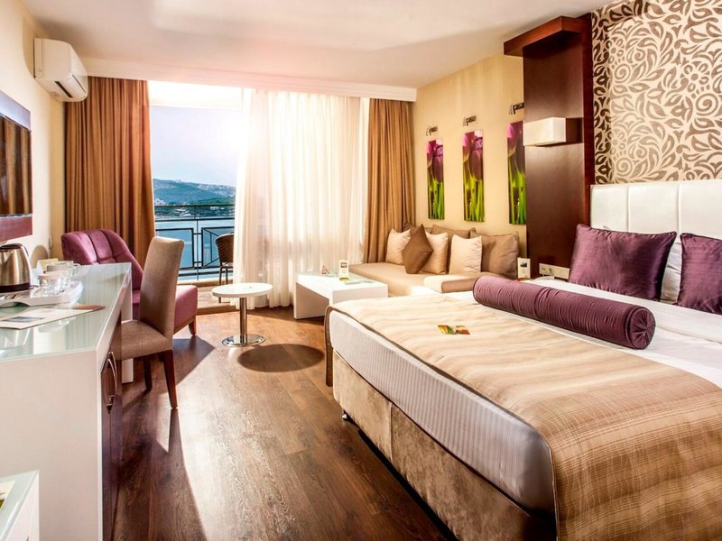 - Izba De Luxe s výhľadom na more (DZM2), dvojlôžková izba, nefajčiarska izba, morská strana, výhľad na more, cca 20 - 28 m², posledná čiastočná rekonštrukcia v roku 2014, celkový počet izieb v tomto type izby: 1, rozdelenie takto: 1 spálňa, 1 manželská posteľ, 1 rozkladacia pohovka, detská postieľka: bez poplatku, nutná žiadosť a rezervácia, klimatizácia: bez poplatku, sezónne, individuálne nastaviteľné, podlaha: parkety, trezor: nie Poplatok, príslušenstvo na prípravu kávy/čaju, minibar: bez poplatku, voda: bez poplatku, dopĺňanie zásob minibaru: denne, Internet: WLAN/WiFi: bez poplatku, TV: s plochou obrazovkou, satelitná TV, izbová služba: 24 hodín denne, za poplatok , upratovanie: denne 9:00 - 18:00, zdarma, sprcha, WC, fén, balkón