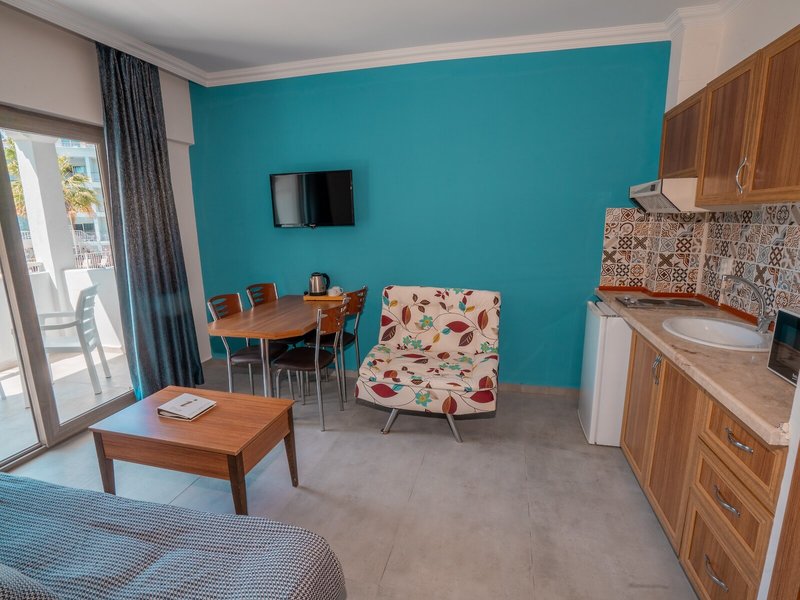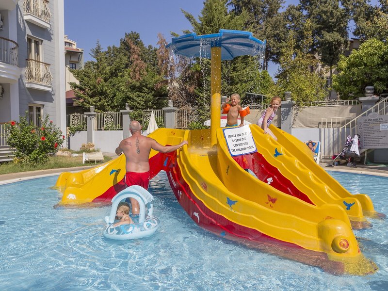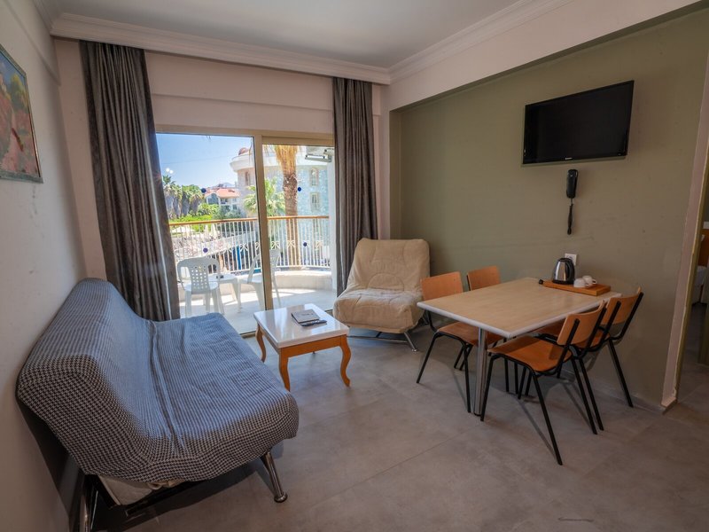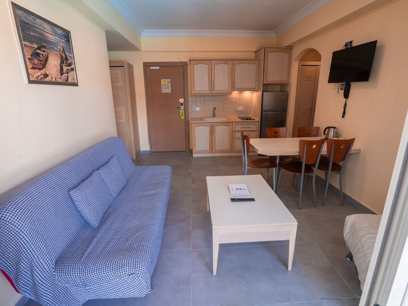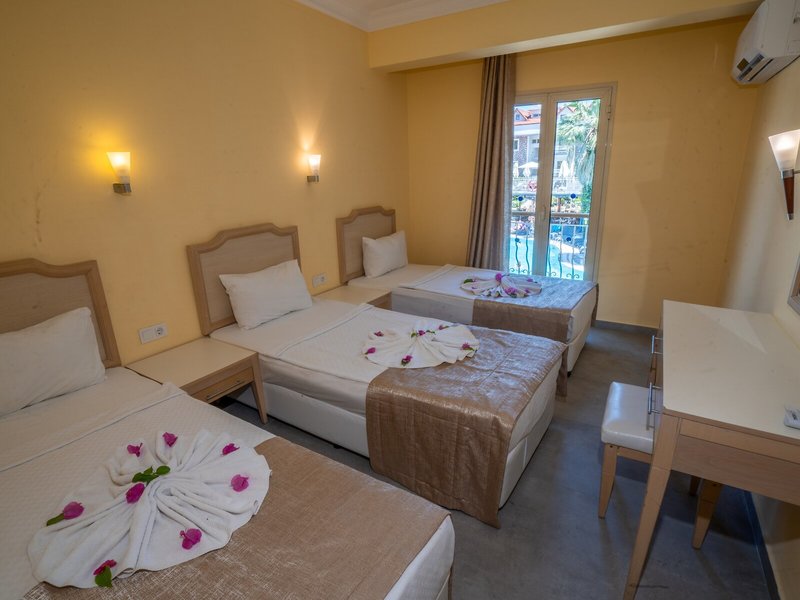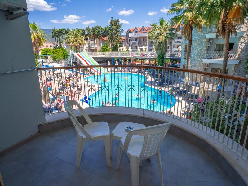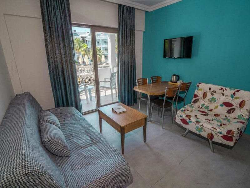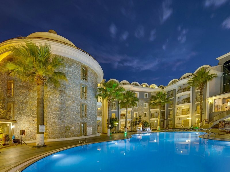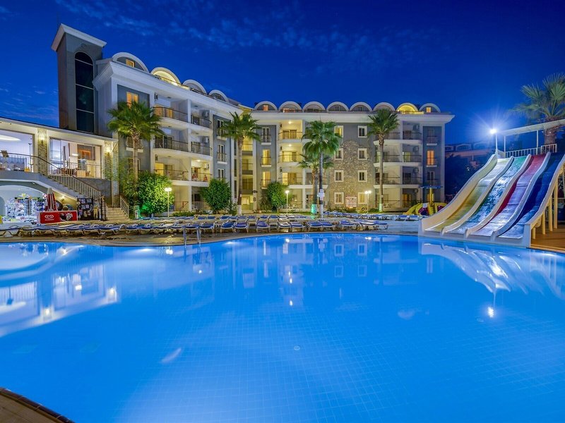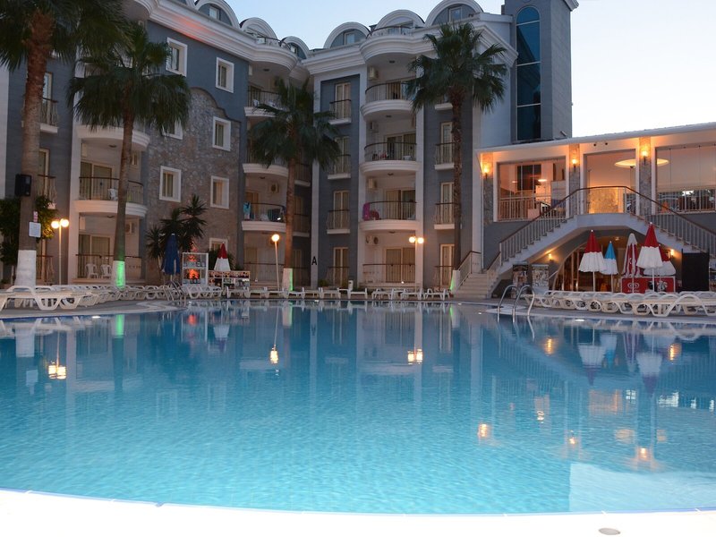 Poloha a okolie Ideálne umiestnený apartmánový hotel je asi 5 minút chôdze od hlavnej ulice a nákupných možností. Na pláž a k mnohým barom a reštauráciám, ktoré lemujú promenádu, je to asi 7 minút.Do centra mesta Marmaris sa hostia ľahko dostanú asi po 4 km, napríklad verejnou dopravou alebo vodným taxíkom. Autobusová stanica Marmaris je vzdialená približne 4 km a letisko Dalaman približne 110 km.