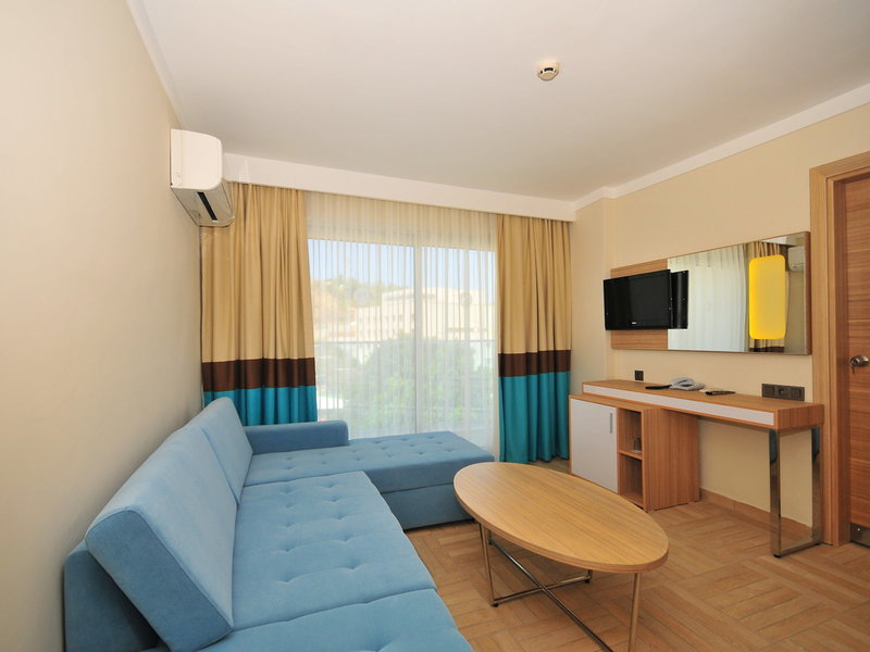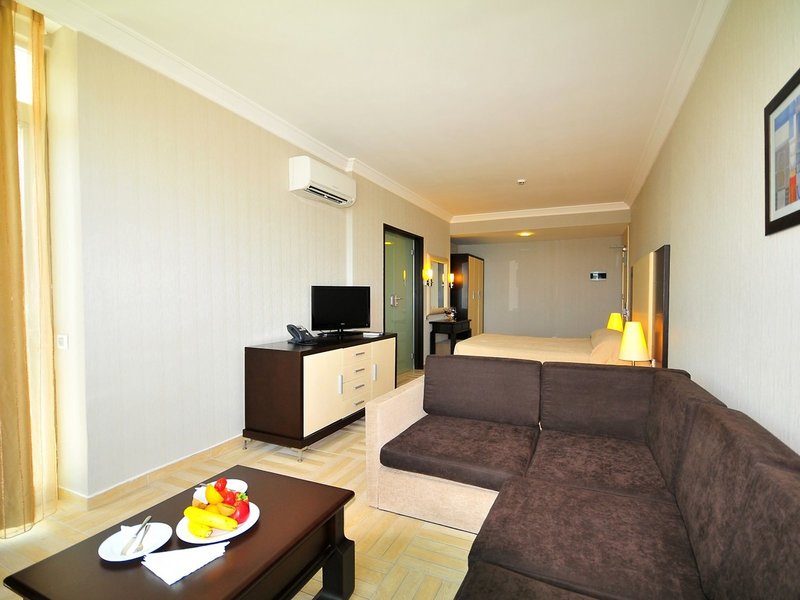 - Junior suita (JSM1), junior suita, vo vedľajšej budove, výhľad na more, cca 28 m², posledná kompletná rekonštrukcia 2012, celkový počet izieb v tomto type izby: 1, rozloženie takto: kombinovaná obývačka/spálňa, 1 manželská posteľ , 1 rozkladacia pohovka, klimatizácia: zadarmo , individuálne nastaviteľná, podlaha: dlažba, trezor: za poplatok, pohovka, kávovar/čajník, minibar: za poplatok, voda: zdarma, telefón, Internet: WLAN/ WiFi: zadarmo, TV: s plochou obrazovkou, platená TV, satelitná TV, upratovanie: zadarmo, sprcha, vaňa, WC, papuče: zadarmo, fén, balkón s posedením