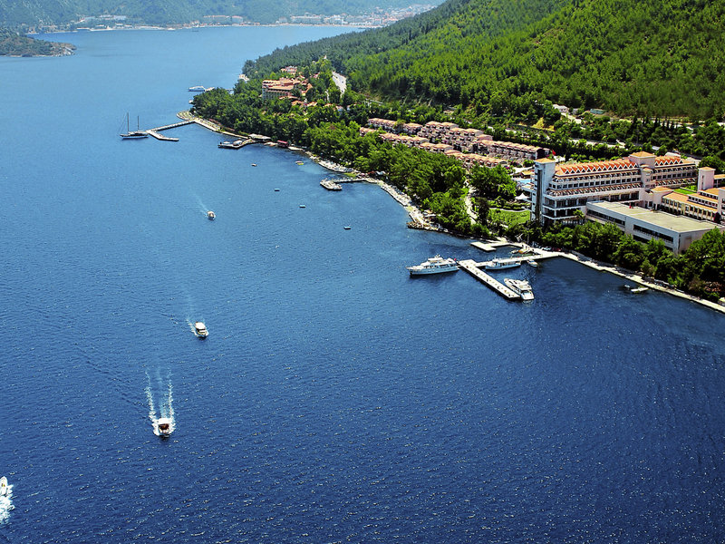 Lage & Umgebung Das Hotel liegt direkt an einer von Pinien gesäumten Küste zwischen Marmaris und Içmeler. Das Zentrum von Marmaris ist in ca. 3 km Entfernung erreichbar. Eine Bushaltestelle mit Verbindungen nach Marmaris befindet sich unmittelbar vor dem Hotel. Der Yachthafen von Marmaris liegt in rund 4 km Entfernung, die antike Stadt Amos in ca. 2,5 km.