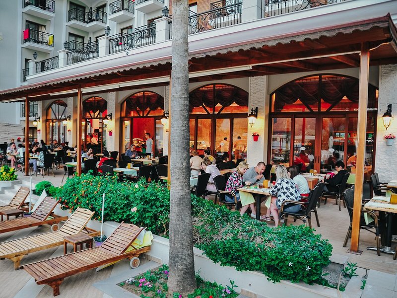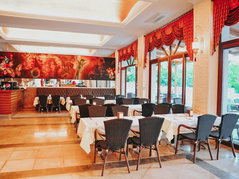 Jedlo a pitie: Možnosti stravovania zahŕňajú kaviareň, bar a krčmu. Hostia majú prístup do nefajčiarskej reštaurácie s klimatizáciou, vysokými stoličkami a oddeleným priestorom pre fajčiarov. Ubytovanie ponúka rezervovateľné stravovacie služby vrátane prenocovania vrátane raňajok, polpenzie a all inclusive. Bohaté raňajky formou bufetu, obed à la carte a pestrý večerný bufet sú chutné a rozmanité. Hotel ponúka široký sortiment alkoholických a nealkoholických nápojov.