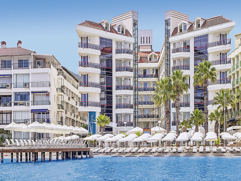 Lage: In Marmaris in der 1. Strandreihe, durch die Promenade vom Sandstrand (mit Kies durchsetzt) getrennt.Zahlreiche Einkaufs- und Unterhaltungsmöglichkeiten, Restaurants und Strandbars in unmittelbarer Nähe. Zum Ortszentrum mit zahlreichen Einkaufs- und Unterhaltungsmöglichkeiten ca. 2 km (Minibusverbindungen).