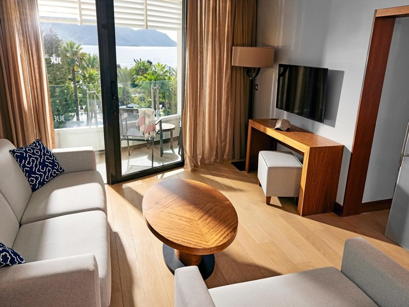 - Deluxe Suite Sea View (SUM2), Suite, Nichtraucherzimmer, Meerseite, Meerblick, ca. 50 m², letzte Komplettrenovierung 2013, Gesamtanzahl der Räume in diesem Zimmertyp: 2, Aufteilung wie folgt: kombiniertes Wohn-/Schlafzimmer, Klimaanlage: ohne Gebühr, Mai - Oktober, individuell regelbar, zentral gesteuert, Heizung: November - April, individuell regelbar, zentral gesteuert, Fußboden: Laminat, Safe, Bügeleisen, Bügelbrett, Espressomaschine, Kaffee-/Teezubereiter, Wasserkocher, Minibar: ohne Gebühr, Softdrinks: ohne Gebühr, Wasser: ohne Gebühr, Minibarauffüllung: täglich, Telefon, Internet: WLAN/WiFi: ohne Gebühr, Fernseher: Flatscreen, Radio, Reinigungsservice: gegen Gebühr, Dusche, Badewanne mit integriertem Whirlpool, WC, Bademantel, Slipper, Föhn, Kosmetikspiegel, Balkon: mit Sitzgelegenheit