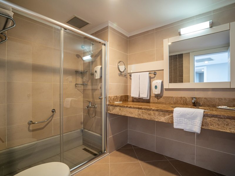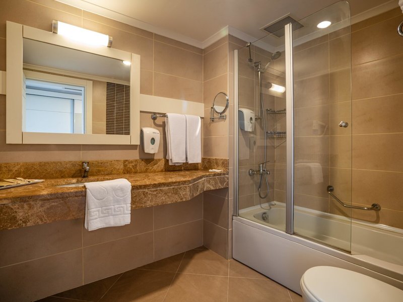 - Standart Large Room Sea View (FZM1), Familienzimmer, Nichtraucherzimmer, im Hauptgebäude, Meerseite, Meerblick, ca. 39 m², kombiniertes Wohn-/Schlafzimmer, 1 Doppelbett, Babybett: ohne Gebühr, bei All Inclusive inklusive, Anfrage notwendig, Reservierung nicht notwendig, 1 Etagenbett, Klimaanlage: ohne Gebühr, bei All Inclusive inklusive, April - Oktober, zentral gesteuert, Fußboden: Laminat, Safe: Barzahlung, pro Tag ca. 1.50 EUR, Minibar: ohne Gebühr, bei All Inclusive inklusive, Softdrinks: ohne Gebühr, bei All Inclusive inklusive, Wasser: ohne Gebühr, bei All Inclusive inklusive, Minibarauffüllung: täglich, Telefon, Internet: WLAN/WiFi: Barzahlung, pro Woche ca. 15 EUR, Fernseher: Flatscreen, im Schlafzimmer, deutsches Programm, Sat-TV, Roomservice: gegen Gebühr, Barzahlung, Dusche, WC, Bademantel: gegen Gebühr, Barzahlung, Slipper: gegen Gebühr, Barzahlung, Föhn, Balkon: mit Sitzgelegenheit
